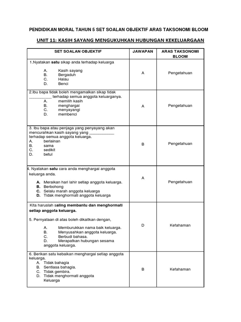 Pendidikan Moral Tahun 5 Set Soalan Objektif Aras Taksonomi Bloom Pdf